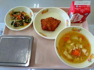 ご飯 チキン味噌カツ 小松菜のおひたし ジャガイモのみそ汁 牛乳