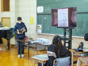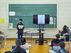 今日は,一人一人が調べたことの発表会を行いました。事前に作ったポスターをモニターに示しながら,手書きした読み原稿に即して発表していました。