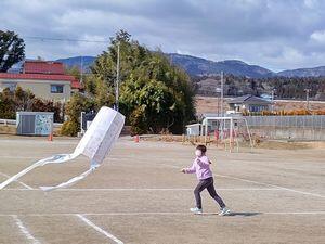 東昇降口のすぐ前では,竹とんぼを飛ばしていました。風の影響は受けますが,3人とも上手に飛ばすことができました。校庭の中央では凧揚げです。風が強かったので走る必要は無かったのですが,最初は頑張って走っていました。でも,風下に糸を伸ばせば飛ぶことに気付いたようです。