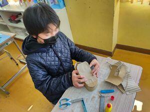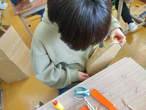 段ボールの特徴を生かし,切ったりはがしたり折り曲げたりして,立体に表すことが,ここでの学習内容なのですが,難しいポイントは平面の段ボールから立体の靴を作ること,そのためにどう切り出し,どう接着するかをイメージすることの2つだと感じました。