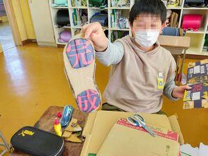 1組の子どもたちが上手だったのは,段ボールに印刷されていたロゴを生かすこと。靴の底や甲の部分に貼って楽しんでいました。ちなみにS君の頭には「自販機での販売はできません」というロゴが貼っついていました。