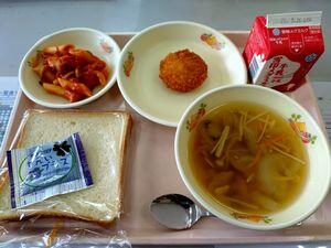 豆乳食パン ブルーベリージャム チーズ入りコロッケ 鶏肉とペンネのトマト煮 あさりのスープ 牛乳