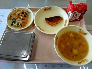ごはん 鮭の塩焼き 切り干し大根のカレー煮 もやし汁 牛乳