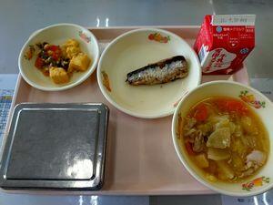 ごはん イワシの梅煮 厚揚げの味噌炒め 豚汁 牛乳