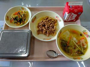 ごはん 焼き肉(セルフビビンバ用) ナムル(セルフビビンバ用) 塩ワンタンスープ 牛乳