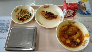 赤魚の棒々鶏ソースがけ 青梗菜の和え物 チゲ風スープ 牛乳