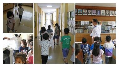 6月18日(木)に,2年生の案内で1年生が学校探検をしました。初めて入る職員室では先生方の話を聞いたり,パソコンやコピー機を見たりしました。校長室では歴代校長の写真について質問するなど,興味津々で回っていました。