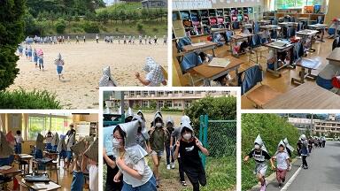 6月23日(火)に,地震・津波対応避難訓練を実施しました。10時30分に校内放送で地震発生がアナウンスされると,よく聴いて素早く机の下に頭を隠す避難行動を取ることができました。次に,防災頭巾を身に着けてそれぞれの避難口から校庭に避難しました。さらに津波注意報が発令された設定で,校庭から高台に避難しました。暑い中の避難訓練だったのでなかなか大変でしたが,無駄話をせずによく聴いて素早い行動がとれていました。