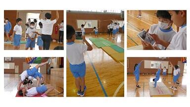 準備運動の後,側転の練習をしました。技のポイントを確認した上で,グループごとにiPadで撮影し合い,自分の動きを目で見て確認し,練習しました。録画された動きを止めてみたり,実際にやってみたりして友達同士で教え合う姿があちこちで見られました。ICTの活用をして考えながら取り組んでいます。その後,自分なりの技を組み合わせて連続技に挑戦しました。