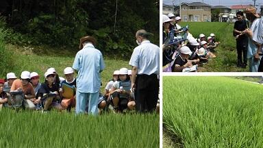 8月4日(火)に,5年生は社会科の米作りの学習で水田の観察に行きました。毎年お世話になっている畠山正夫さんから,稲作の苦労などを教えていただいたり,出穂の様子を観察させていただきました。登下校でいつも見ている水田をより身近に感じることができました。