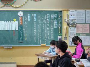 5年2組は学級活動の話し合い活動をしていました。今日の議題は「あけおめ会を開こう」です。楽しい集会の議題で,話し合いの進め方,まとめ方,合意形成の仕方を鍛えています。