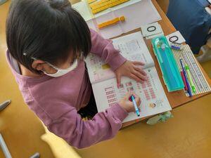 例えば,教科書に描かれている色鉛筆の数を数えるために,子どもたちは色鉛筆の絵の内,十のまとまりがいくつあるかを丸で囲み数えます。次にばらの色鉛筆が何本あるかを数えます。十のまとまりの数を十ブロックで,ばらを一のブロックで表していきます。十の位の1と一の位の1では表す大きさが違うことを操作により定着させていきます。これを十進位取り記数法といいます。