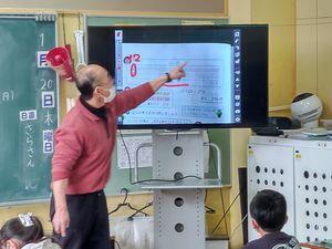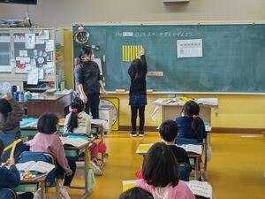 2校時,3年生は算数,今日の学習内容は2桁×2桁の筆算の導入です。以前も紹介しましたが,3年生の算数は児童を2つのグループに分けて担任のO先生と主幹教諭のY先生が少人数指導で進めています。