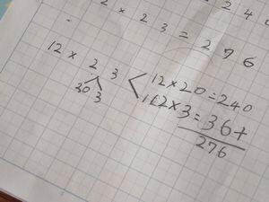 今日の学習のメインはまだ未習の12×23の計算の仕方です。子どもたちは12×20と12×3に分けて考えてそれを合わせれば求められるのではないかと考えました。そこから2段重ねのかけ算の筆算へつなげていきます。