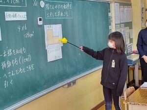 5年1組は算数で三角形の面積の求め方を考える学習です。長方形や正方形などの既習の図形に変形して面積を求めます。算数教科担任のM先生は,子どもたちが自分の考えを分かり易く説明できるようにすることを大切に指導してきました。少しずつ力が付いてきたように感じます。