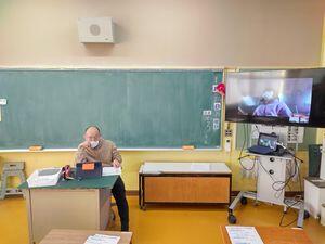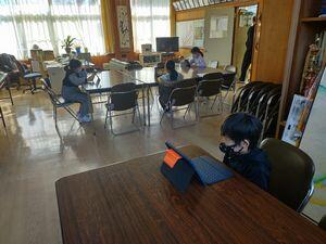 多目的室,児童会室,図工室,図書室,(音楽室が使用中だったので特別に校長室も)に子どもたちが分かれて,教室のO先生とZoomをつなぎました。