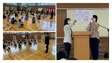 体育館で,校長先生のお話,養護教諭の紙芝居による新型コロナウイルスのお話,6年生の先生方の紹介をしました。真剣な表情で,先生方のお話を聴いていました。