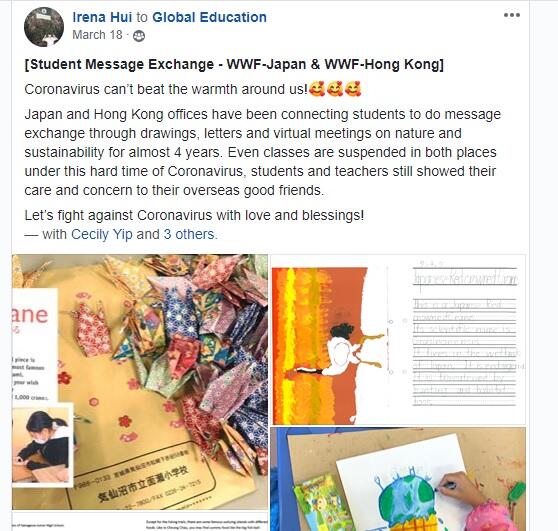 昨年度5年生がWWF Japanを通して交流していた香港のケイヤン小学校に送ったメッセージや折り鶴が届いたというメールがきました。香港の学校も臨時休校のようですが,互いに気づかう気持ちが生まれています。今後のWeb交流を楽しみにしています。
