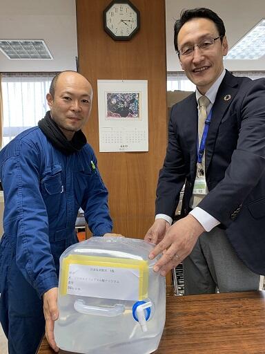 5月1日(金)気仙沼青年会議所の直前理事長の武田哲也さんが来校し,消毒用に次亜塩素酸水をいただきました。