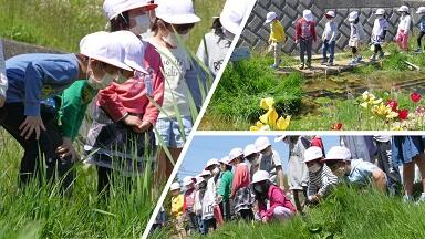 校庭に出て,春の植物や生き物を観察したり,遊具や学校ビオトープ「オモトープ」の使い方を学んでいました。
