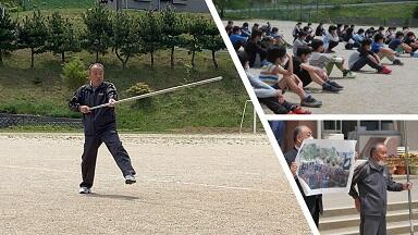 5月12日(火)に,総合的な学習でお世話になっている尾形修也さんが来校し,尾崎大名行列の一部を演舞していただきました。尾崎大名行列は,今から約140年前の明治時代の初めに,疫病がはやった時,当地方だけ流行らなかったことに感謝して八幡様の神輿渡御に大名行列を奉納したことが始まりです。