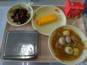 ごはん 厚焼き卵 ひじきの煮物 豚汁 牛乳