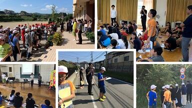 9時の地震発生には放送に合わせて身を守る一次避難を,その後津波警報が発令されたことで二次避難場所に集合しました。中学生が安否確認の名簿作成等の訓練をしました。避難の訓練後は各自治会毎の集会所に移動して,地区毎に計画された防災活動を行いました。