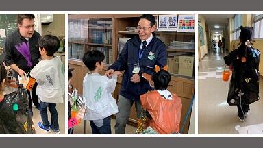 3人の子どもたちが変装して職員室にあらわれ,化け猫は長い爪を振りかざし,オオカミは「ワオーン!」と遠吠えを披露。「うらめしや~」と和風のお化けまで登場しました。3人の団結によって見事にお菓子をゲットすることができました。