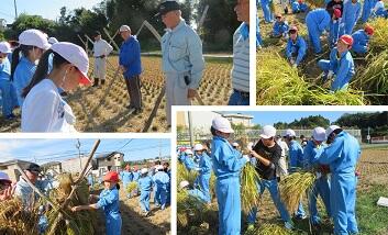 5年生が,地域の農家 畠山正夫さんの水田で稲刈