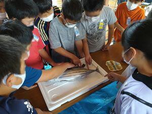 前半は,お持ちいただいたカツオについてのお話をいただきました。1本丸々のカツオを触ったことがある子はゼロ,みんな興味深そうに触っていました。自力でエラが開けないため,口を開けて泳ぎ続けないと死んでしまうこと,体の形や内臓がそれに適したものになっていることを実物を使って解説してくださいました。