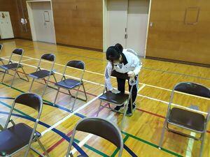 先生方にも会場の最終準備をしてもらいました。パイプ椅子の消毒,出入り口へのサーモカメラや消毒液の設置など感染対策をしてお待ちしています。