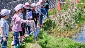 たくさんの「見つけたよ」があったため,なかなかオモトープにたどり着きませんでしたが,水面を泳いでいるメダカを見つけて歓声があがりました。