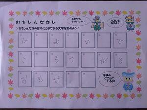お店以外にもお楽しみがあります。「おもしん探し」です。面瀬小学校のマスコットキャラクターである「おもしん」とその仲間「はなしん」「おもぴー」を探し出し,裏に書いてある文字を集めて暗号文を解読します。