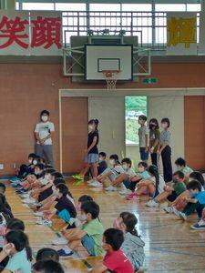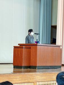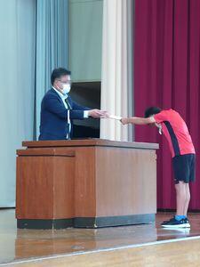 最初に,6月2日に行った市内体育祭の賞状を伝達しました。体育主任のR先生から入賞者が紹介されました。次に,一関で6月5日に行われた市の陸上大会の賞状を伝達しました。
