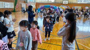 体育館には入れませんでしたが,2年生はメダルのプレゼント,3年生は一人一人に向けたこの会の招待状,4年生は花のアーチ,5年生はくす玉などの装飾を担当し,1年生を迎えました。