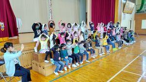 お返しとして,1年生は,先ず,下校グループ(方面)の色ごとに自己紹介のご挨拶をしました。同じ色の6年生も起立してくれ,顔合わせができました。1年生はパプリカのダンスも披露。6年生や計画委員の子供たちも曲に合わせて体が自然に動いていました。
