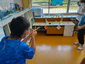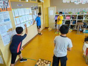 先日,話し合いの様子を紹介した5年2組で今日,夏祭りが開かれました。射的を担当するY君が校長室に誘いに来てくれたので参加することができました。