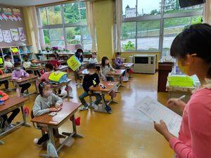 過日担当から,一昨日と今日,「緑の羽募金」への協力をいただきたいという文書を保護者の皆様に配付しました。今日はその2回目の募金活動の日です。環境美化委員の子供に付いて,1年1組にお邪魔しました。