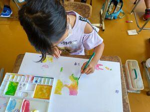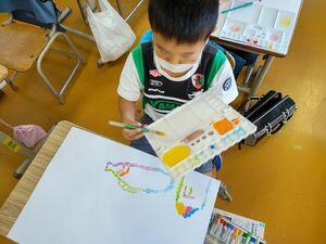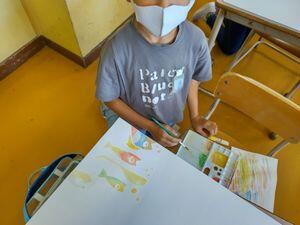 4校時,3年生の図工の授業を参観しました。「にじんで広がる色の世界」とう単元で,白いクレヨンで描いた形を生かし,絵の具をにじませた世界を描く内容です。