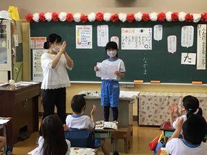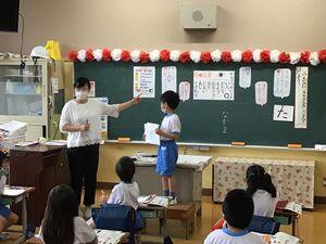 「ぼくは何を見つけたでしょうか?『も』ではじまります。」「正解です。ぼくはオモトープの近くで,モンシロチョウを見つけました。」この他に「風鈴」「川」「カモシカ」が答えのクイズが出されました。「話すこと・聞くこと」の学習は国語の時間だけでなく,生活科などの学習とも組み合わせて,繰り返し取り組ませることで身に付いていきます。