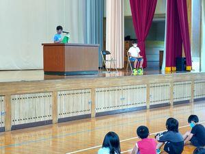 2校時は体育館で終業式を行いました。校長式辞の後,児童を代表して2年生のKS君と5年生のCS君が1学期の振り返りの作文を読みました。