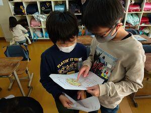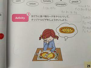 2校時,4年生では外国語活動の学習をしていました。ユニット7は,What do you want? I want (potatoes), please. How many? (Two), Here you are. Thank you.などが言語材料です。今日はユニットのまとめとして,オリジナルピザを作って,それを紹介し合う活動をしました。