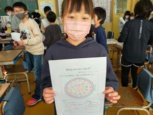 最後に代表3人が前に出て,発表しました。最後に発表したKさんのピザはなんとアンパンマンの顔のピザ(名付けて「ピザパンマン」)でした。みんな楽しく,欲しいものやのっけたものについての表現を学んでいました。