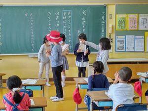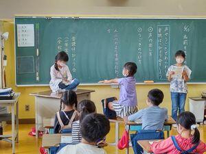 「声や動きで表して音読発表会をしよう」という目当てに沿って,どのグルーブも読み方や動きを工夫していました。会話文を読む子供たちは,それを暗唱していて,劇のように動作も入れて表現していました。