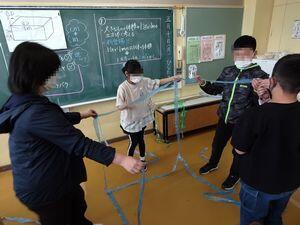 M先生は,適用問題を解き,学習のまとめを行ったあとすぐに,すずらんテープで1㎥を表す活動に取り組ませました。量感をもたせるためです。「だいたいこんな形になりますよ」「1㎥には12本の辺があるから,1mのテープ12本だ」などと,話しながら,ふにゃふにゃの1㎥を作っていました。