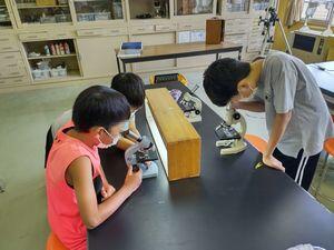 3校時,図書室と理科室から楽しそうな声が聞こえたので,覗いてみると5年2組の子どもたちがS先生と理科の学習をしていました。顕微鏡を使ってアサガオとヘチマの花粉を観察していました。
