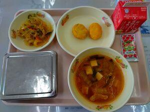 今日の給食は,豚肉,えびやいかなどの魚介類,豆腐や白菜を使って,みそやコチュジャンで味つけをした辛さ控えめのスープを作りました。ほかの国の料理も食べることは,食文化を知る上で大切です。味わっていただきましょう。