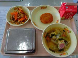 ごはん 蔵王産里芋コロッケ メンマの炒り煮 フカ団子スープ 牛乳