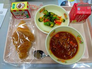 クロワッサン クリスマスサラダ ポークストロガノフ チョコレートケーキ 牛乳