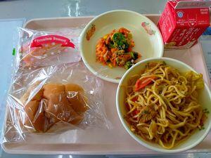 バターロールパン ブロッコリーサラダ ソース焼きそば お祝いミルクレープ 牛乳